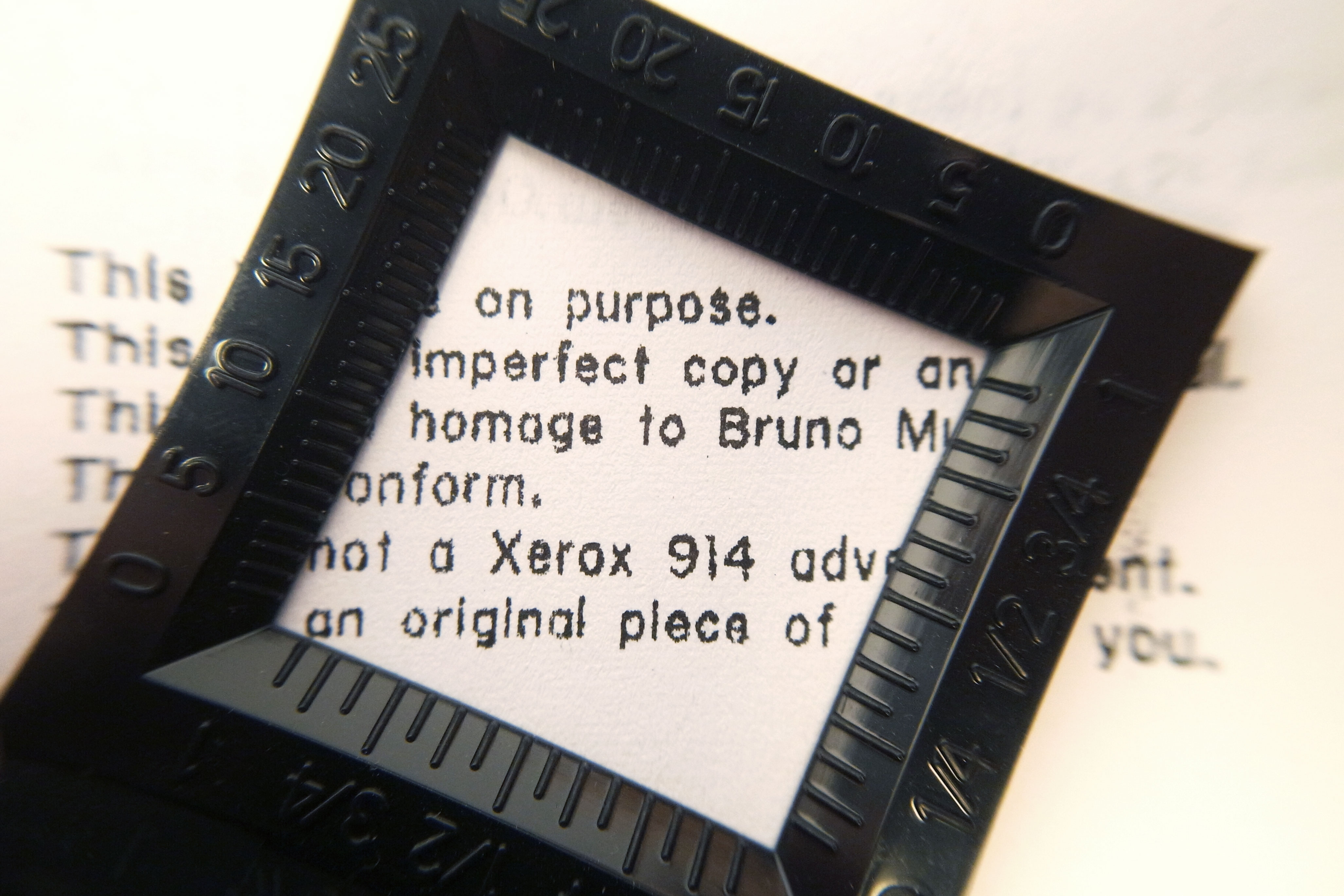 Original Copies addresses the fetishism and sacralization of the original in art and the resulting relation to copies. The idea of one original is the basis of the art market which creates its value through rarity. In an economic system where individualism and property are central, the construct of the genius Artist and limited production are entangled to define the economical value of an artwork. Art institutions often exchange the original with a copy, deluding the public while reiterating the fetish of the original. Photographs are destroyed after exhibition to preserve the unicity of the first print. Original copies is an ironic work that has the copy as a starting point. It shows a Xerox 914 advertisement from 1961. The 914 was the first photocopier, replacing analog duplicators. It revolutionized the copying industry, our reading behavior, and our relation to authorship. From the start Xerox developed its advertisement campaigns around the perfection of the copies, arguing that no differences could be found between the original document and its copies. It is an homage to the artist and designer Bruno Munari. In the 70's Munari produced a series called Original Xerographies. The work consisted in moving objects or images placed on the copier, while still in motion, resulting in 'impossible-to-replicate' image. What was then printed was not a copy of the original but an original itself. During his first show in a gallery in New York, he came with a copier and produced more of his Original Xerographies at the entrance of the gallery and offered them to by-passers. The gallery owner was pissed. The Original Copies are printed on an analog stencil duplicator, where imperfection is part of the printing process. Therefore original and copy merge into one, because what is an original if not an imperfect copy.